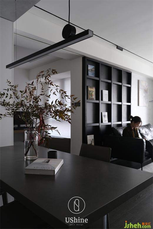 工作室既是獨立的,也是玄關和客廳的過渡,它模糊二者的界限,深圳海納公館家裝設計賦予視覺上的開闊感。在工作室與客廳之間,設計師創(chuàng)新地使用超大尺寸的深色木作沙發(fā)背景墻,現(xiàn)場制成,它既是陳列柜,又可充當工作室與客廳間的隔斷。