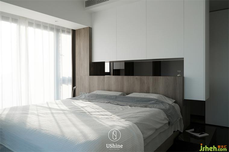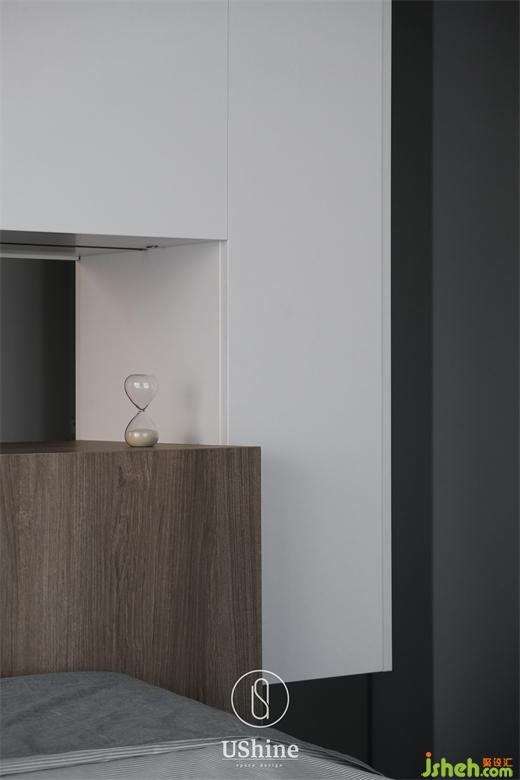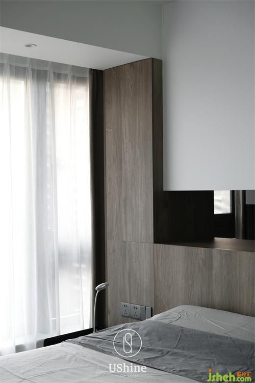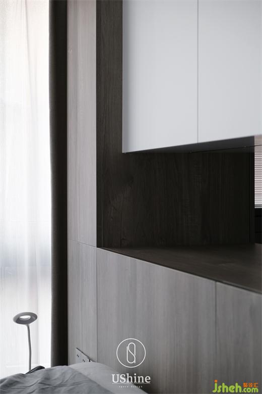 衣帽間延續(xù)同樣的色彩搭配,木色為開放式掛衣置物區(qū),白色抽屜收納細小物件。一塊層板連接兩邊柜體,貼心地充當梳妝臺,以細節(jié)詮釋行隨機能。