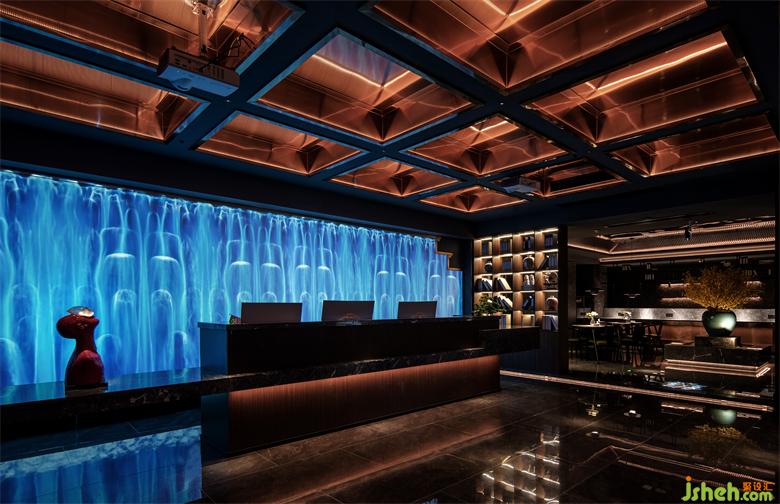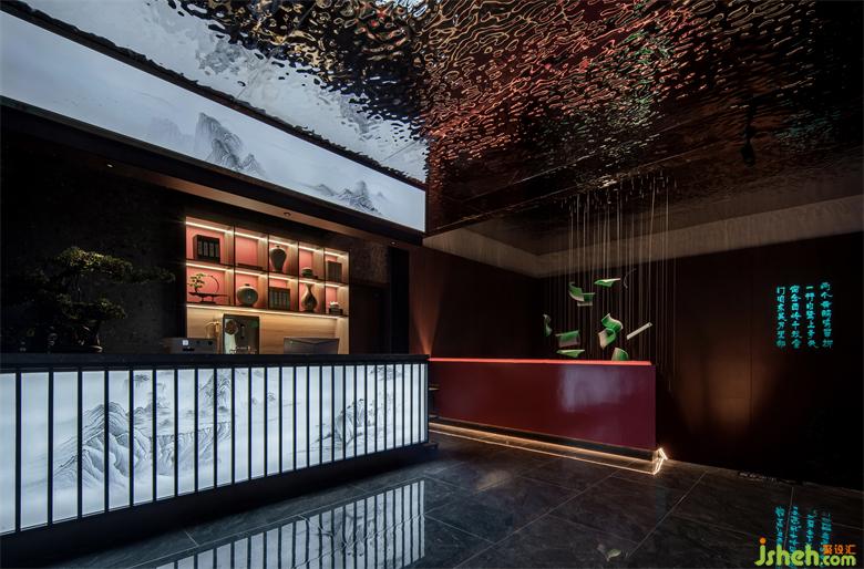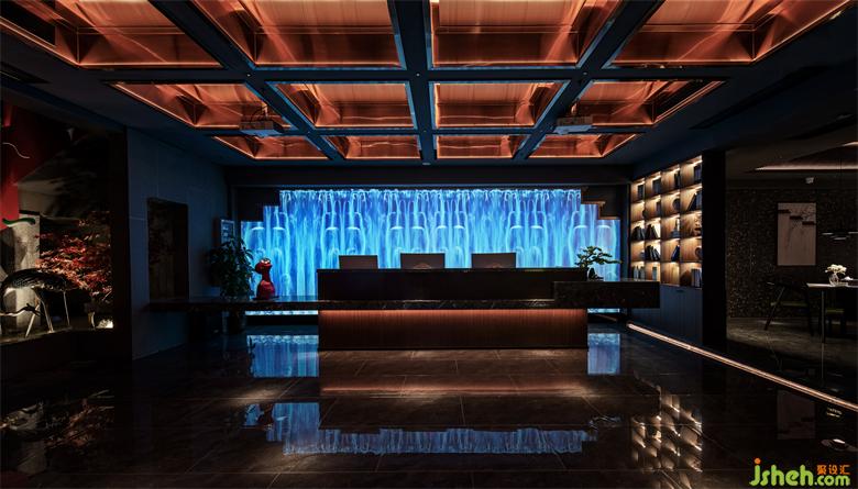 足道設(shè)計(jì)空間入口以退為進(jìn),增強(qiáng)內(nèi)外交互。大堂及前臺(tái)兼顧美學(xué)與功能,以實(shí)現(xiàn)快速為用戶(hù)辦理選房及技師安排等為前提。前臺(tái)的背景將贛派建筑代表元素馬頭墻,與全息投影自然融合,利用現(xiàn)代化的手法,打造出符合當(dāng)下城市生活的東方意境。