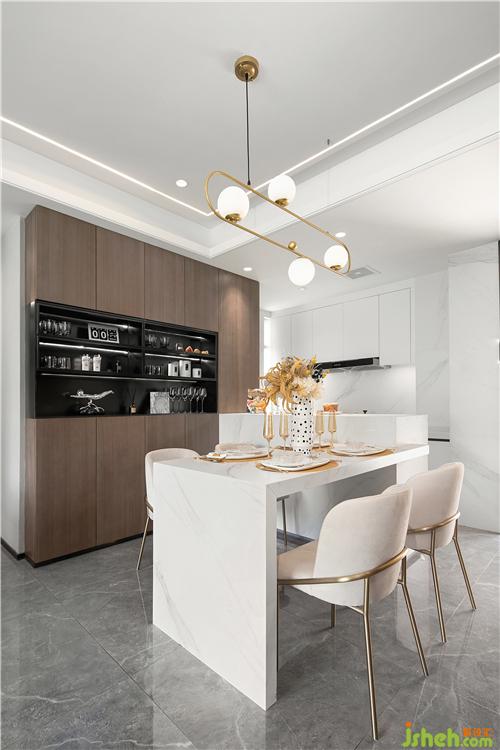 餐廳的設(shè)計以灰色調(diào)簡約的家具造型來突出,家具的線條也是簡約為主 ,燈具采用金屬材質(zhì)來體現(xiàn)出質(zhì)感,餐椅為小巧為主,使得空間更為空曠。