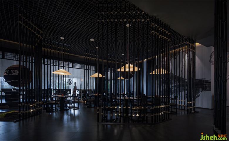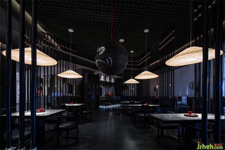三個(gè)獨(dú)立的包間和五個(gè)半開放的卡座空間相立而視,日式爐端燒餐廳設(shè)計(jì)圍合的散座區(qū)以及開放的板前料理區(qū)被日式竹藝隔斷巧妙地分開。高高低低獨(dú)立錯(cuò)落,彼此分隔相互眺望,若隱若現(xiàn)。