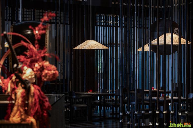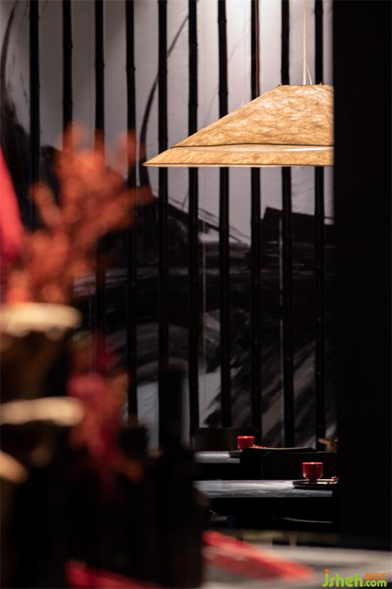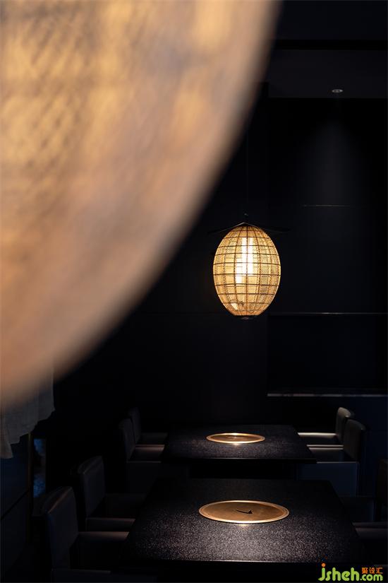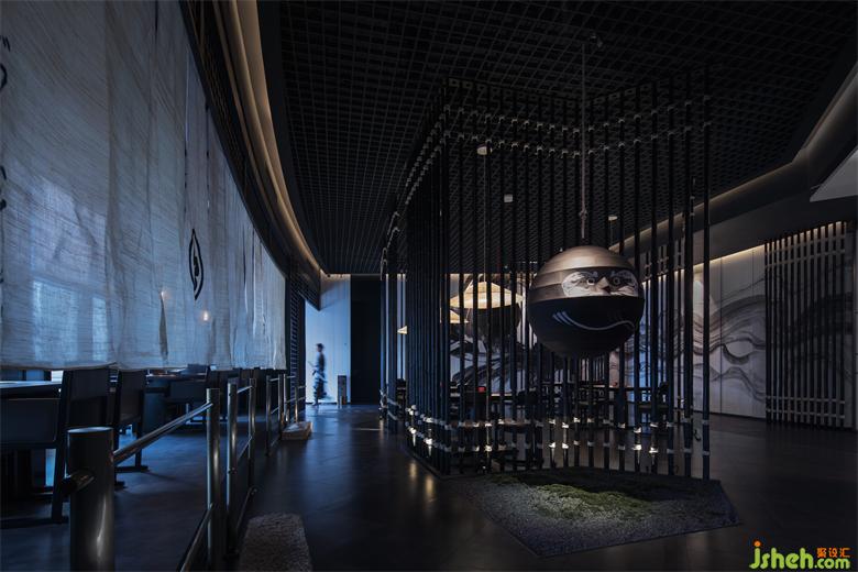 移步至走廊深處是包廂所在,一抹鐵銹紅的裝飾搭配給沉穩(wěn)的空間增添了一絲活力。日式爐端燒餐廳設(shè)計(jì)純黑色的木飾面與時(shí)尚的裝置藝術(shù)品在空間碰撞、交相呼應(yīng),空間變得鮮明起來。