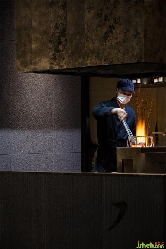吧臺(tái)使用紋理獨(dú)特的深色藝術(shù)大理石,日式爐端燒餐廳設(shè)計(jì)提升了空間的莊重感,更為整體色調(diào)起到了點(diǎn)綴。爐端燒位于吧臺(tái)后側(cè)恰好與進(jìn)門展示相互融合,廚師烹飪燒烤也成為一種優(yōu)雅的表演,也意在還原爐端燒在日本本土之景象。