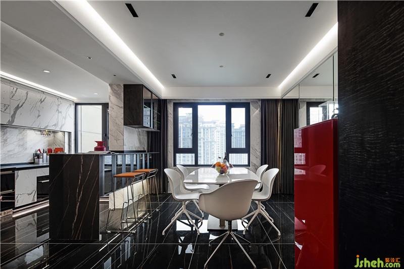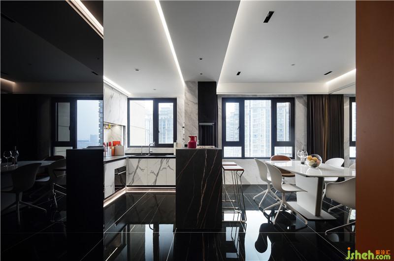 從餐廳進(jìn)入客廳要跨過爵士白的地臺,這一塊小小的白色把餐客廳空間區(qū)分了開來,高低落差的設(shè)計讓空間更有層次,更有儀式感。不僅打破了這一片黑色的沉寂,讓走道的空間在視覺上被縮短,并且與客廳中的地臺遙相呼應(yīng)。