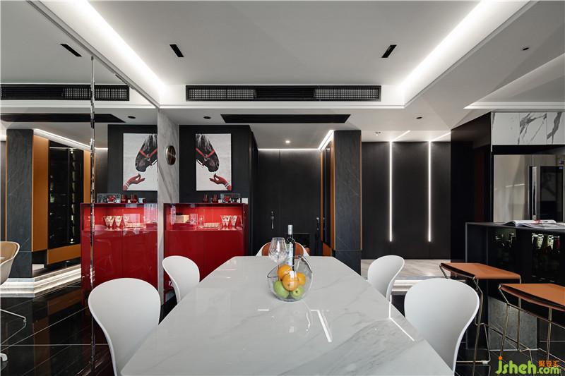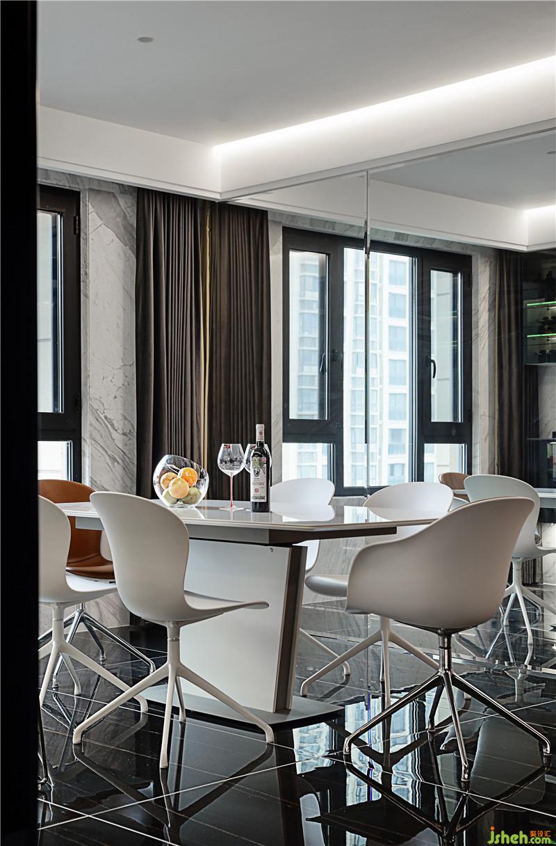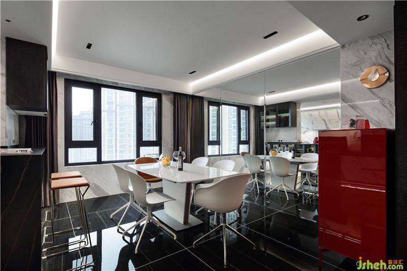 餐廳墻面鏡面的使用讓空間的視覺效果翻倍,在這樣的空間吃飯,人的心情都會豁然開朗。