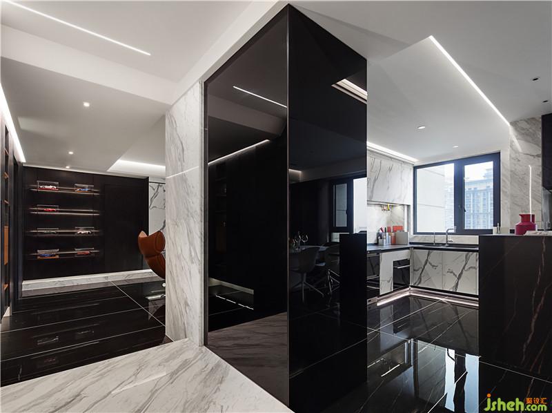 雙開門的冰箱被藏在了兩片黑色玻璃圍成的隔斷之中,也算是物盡其用了。仔細(xì)看你還會發(fā)現(xiàn),廚房的踢腳線都是帶燈光的,而臺面則是與地面大板顏色一致啞光肌理的超薄巖板,細(xì)節(jié)之中高級感無處不在。