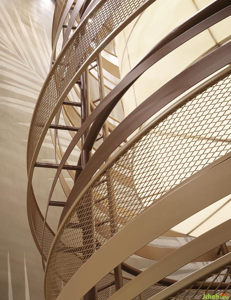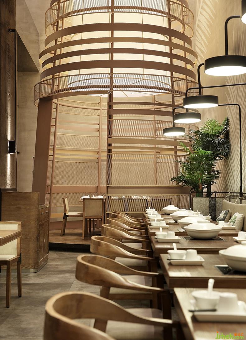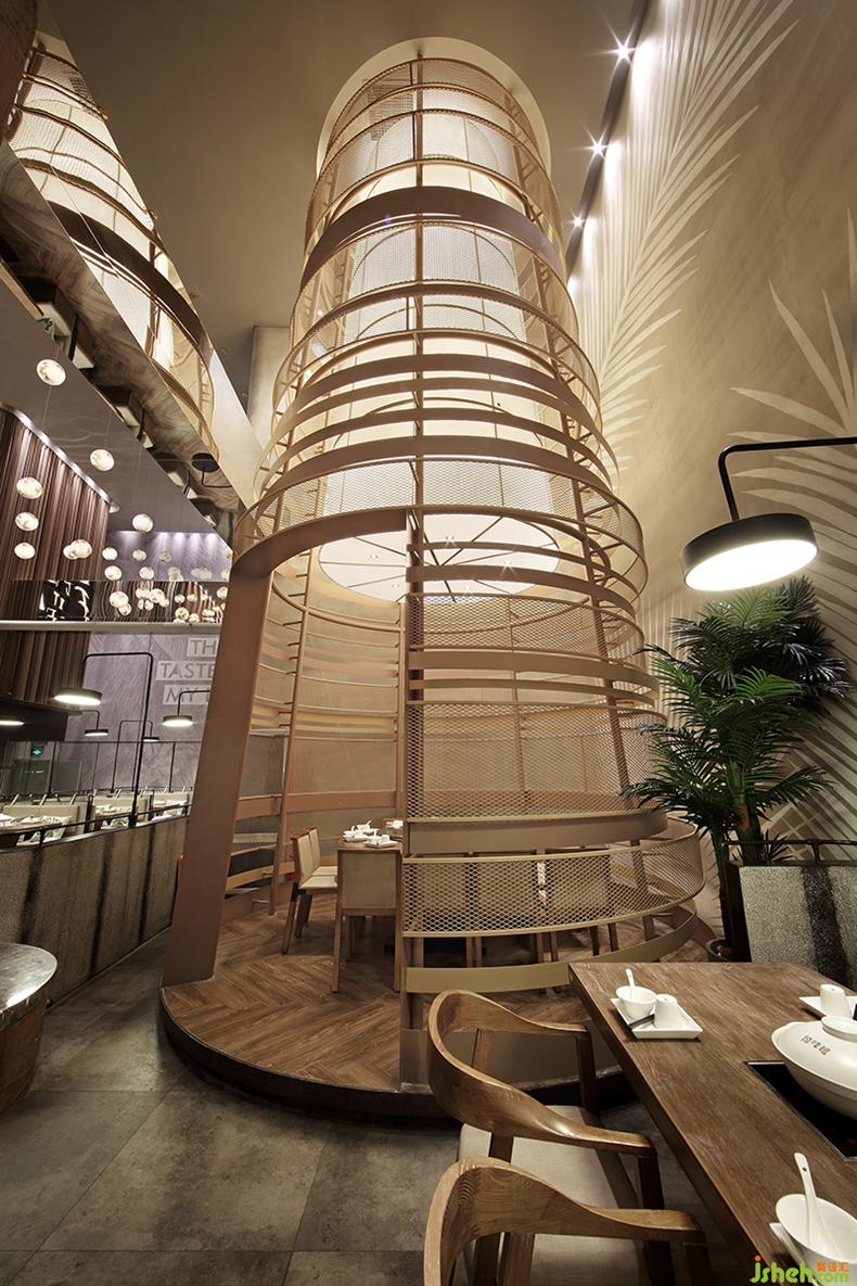 除此之外,設(shè)計(jì)師提取椰樹元素,利用原有建筑10米層高的特點(diǎn),用黃銅打造出椰樹形態(tài)的裝置,一圈一層黃銅纏繞,形象生動(dòng)的刻畫了椰樹桿的自然肌理,在滿足包間功能的基礎(chǔ)上,為空間創(chuàng)造出獨(dú)有的藝術(shù)裝置,在提升藝術(shù)感同時(shí)也增添了一種宏偉的視覺感受。餐廳設(shè)計(jì)