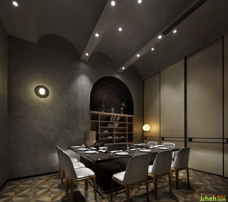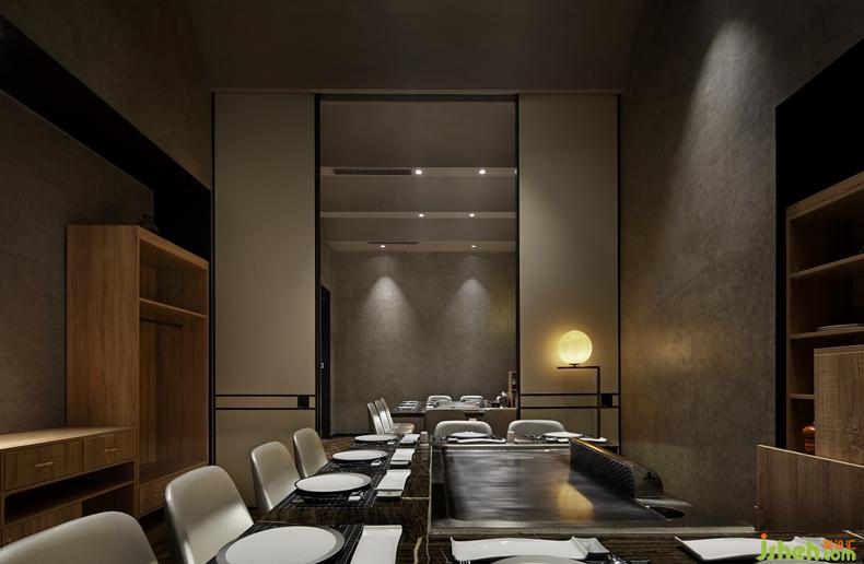 包間區(qū)域強調空間的隱私感,灰色移動門搭配黑色門框,既保護了空間的寬敞性,合理打造出設計感強烈卻又不失優(yōu)雅、閑適的高端空間。天然紋理的灰色石材與天然紋理的地磚相呼應,橡木材質的家居貫穿其間,讓包房空間保留了最自然的姿態(tài)。