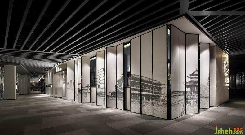 “長安回望繡成堆,山頂千門次第開。”門面采用書簡的設(shè)計手法,一扇扇門半開半闔,營造著端莊的序列感和層次感。西安建筑的影像鋪陳出一幅流動的畫卷,溫潤燈光映襯歲月的質(zhì)感,千年波瀾壯闊的歷史徐徐展開,拉開時空交錯的序幕。餐廳設(shè)計