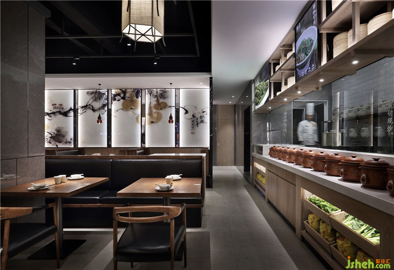 廚房區(qū)開(kāi)了長(zhǎng)型橫向的透明視窗,將食物的呈現(xiàn)過(guò)程演繹成動(dòng)態(tài)的展演現(xiàn)場(chǎng),透著廚房明亮的燈光和忙碌的身影,一蔬一飯飽藏的氤氳溫情,不著痕跡的融入餐敘氛圍。餐廳設(shè)計(jì)
