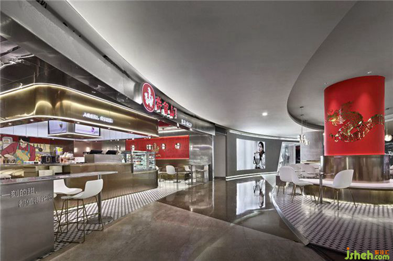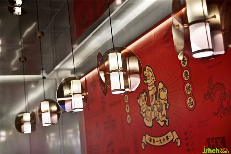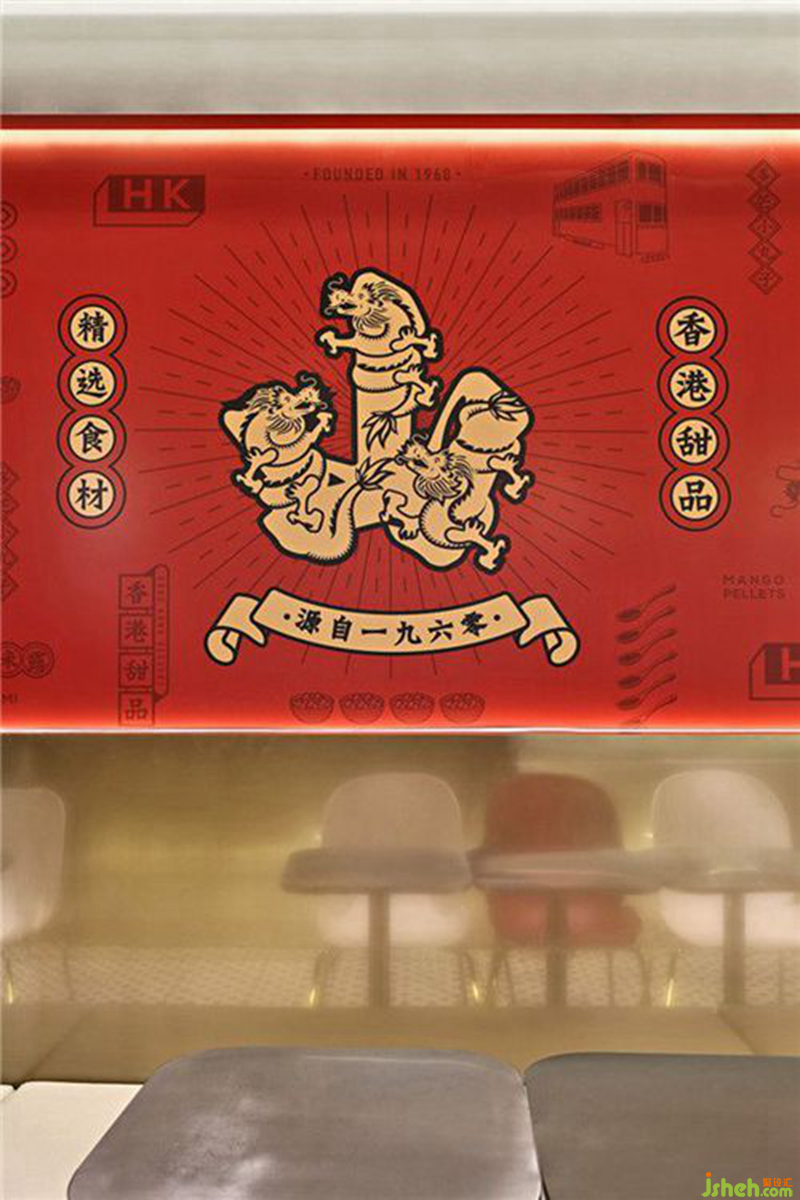 本案設(shè)計(jì)以傳承為依托,運(yùn)用簡(jiǎn)潔明快的方式呈現(xiàn)新潮時(shí)尚的甜品文化。在許留山的空間演繹上,龍紋和朱砂紅的搭配,賦予了空間濃郁的文化氣質(zhì);
