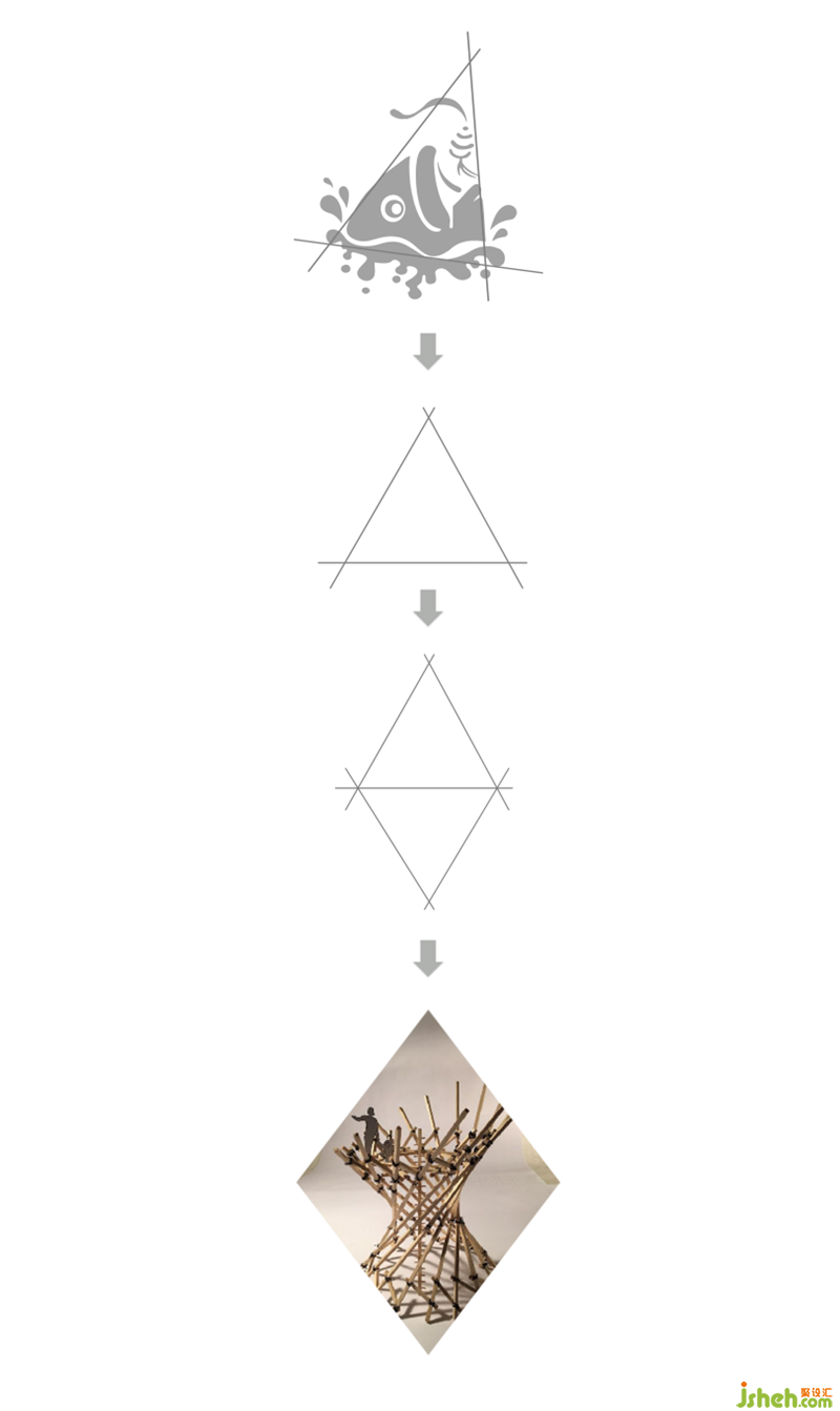 猶如大魚到鯤鵬的靈感轉(zhuǎn)化,全新的大漁空間帶給顧客強烈的視覺沖擊力,讓人耳目一新。同時,還令本案和周邊建筑群形成鮮明的對比,在視覺形成突顯優(yōu)勢。