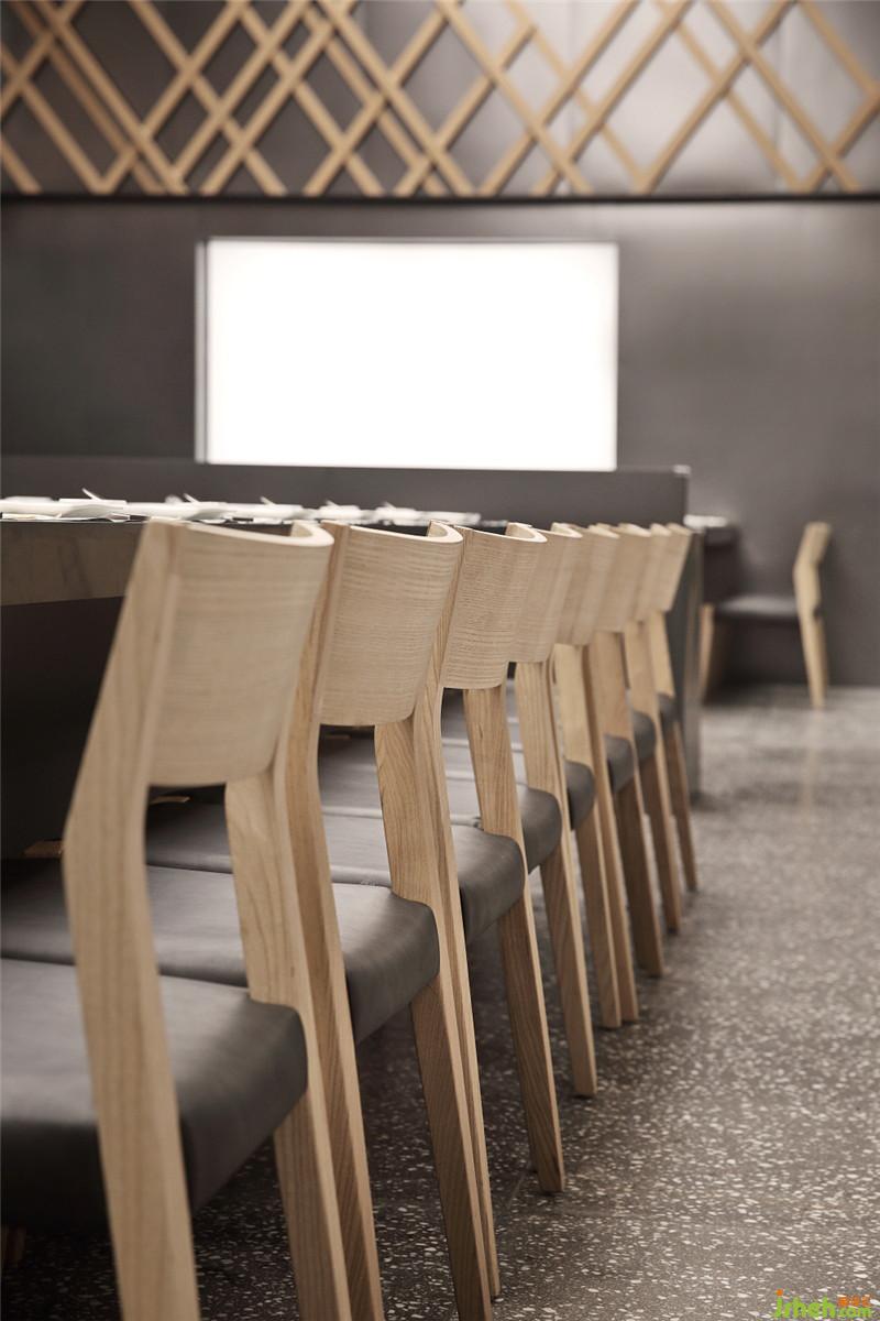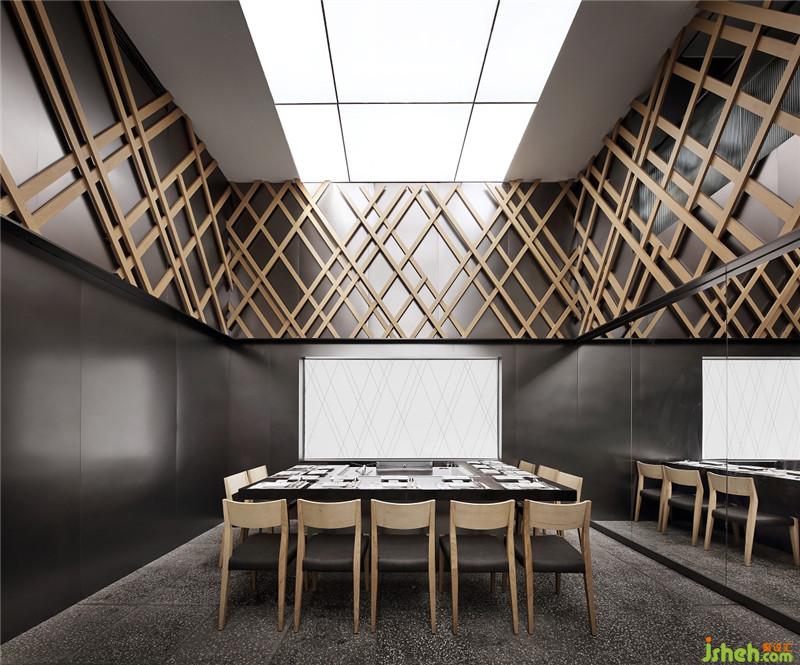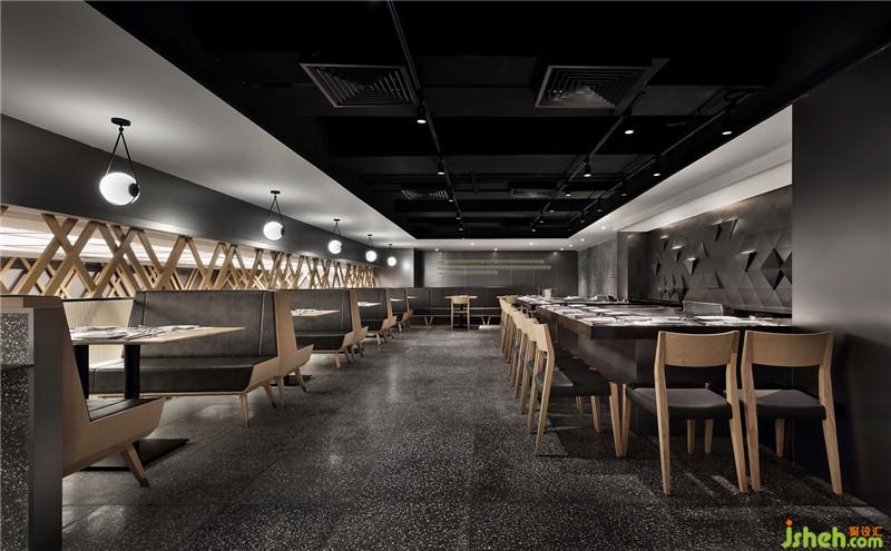 基于此訴求,藝鼎設(shè)計師以大漁的LOGO為靈感來源,通過分解魚頭形狀,進行鏡像、組織,以三角形體的形式呈現(xiàn)在空間里,應(yīng)用現(xiàn)代手法打造了一個簡約、日式、略帶商務(wù)風(fēng)的空間。餐廳設(shè)計