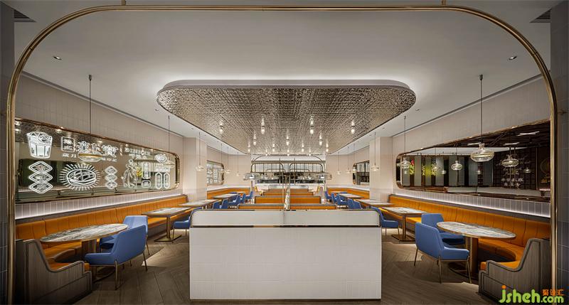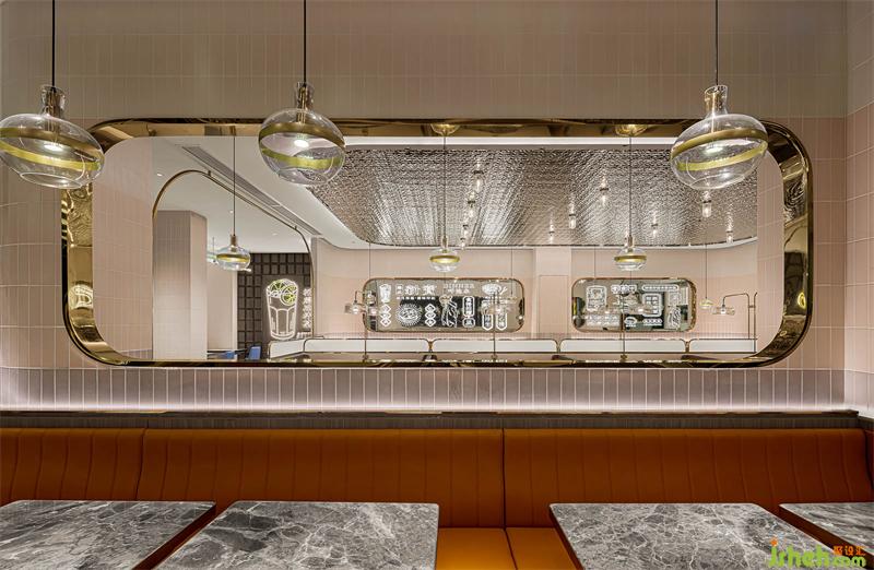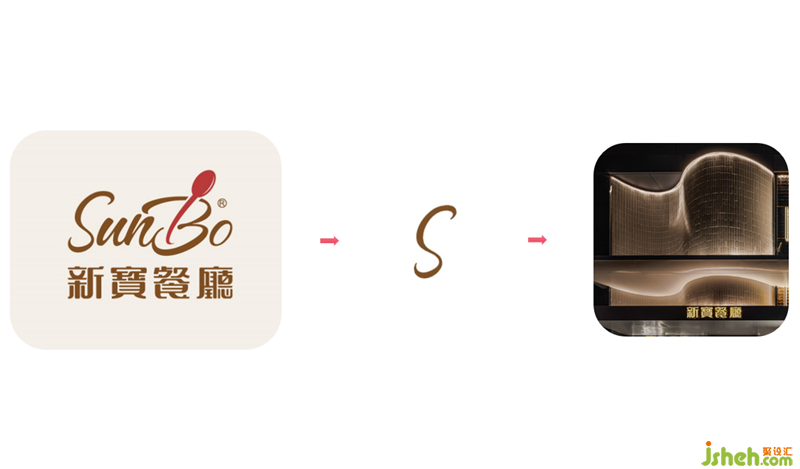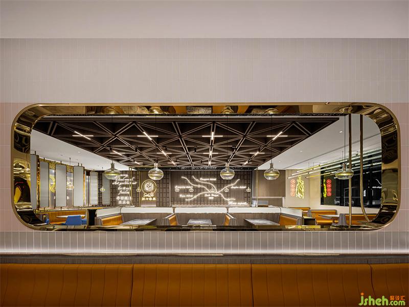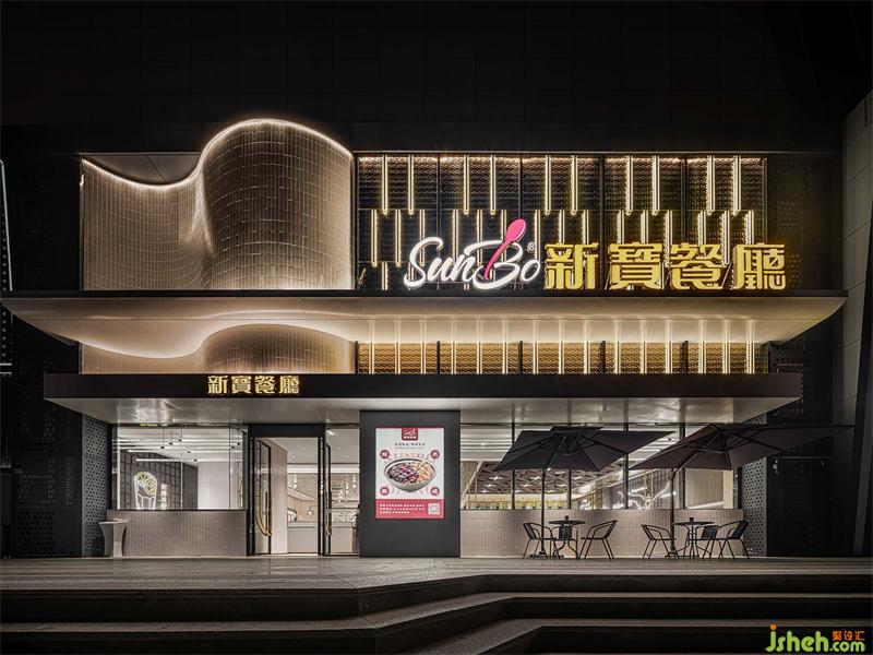 本案港式餐廳設計從新寶餐廳的logo提取元素,以弧形、圓角、矩形的轉化應用,構筑沉浸式的現(xiàn)代港意空間。門頭立體化“S”弧造型有裝置意味,霸道式吸睛,不給人思索余地,卻高度聚焦品牌元素,表現(xiàn)視覺力量。水紋不銹鋼更是形變的弧形之濫觴,在規(guī)則和靈動之間的自由跳躍,躍動的弧形和硬挺矩形碰撞,方中有弧,弧里有方,張弛有度。