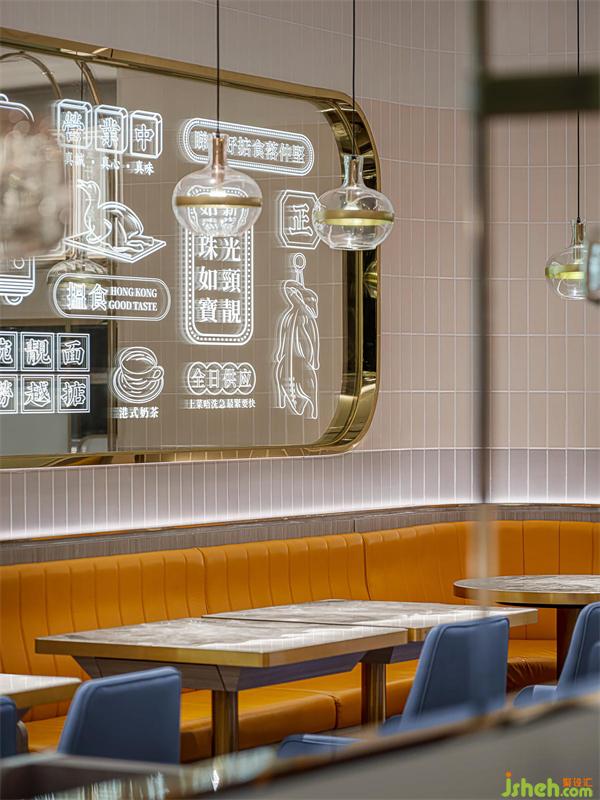 港式餐廳設計室內(nèi)空間上下呼應,左右聯(lián)動,左邊天花上水紋不銹鋼暗藏燈光,精致感瞬間提升了幾個度。鏡面上,香港特色的招幌辨識度十足,霓虹發(fā)光字悄無聲息地拆解香港文化。三種顏色地瓷片變化,讓視覺感觸連線著味蕾享受,并一次次環(huán)繞升華。
