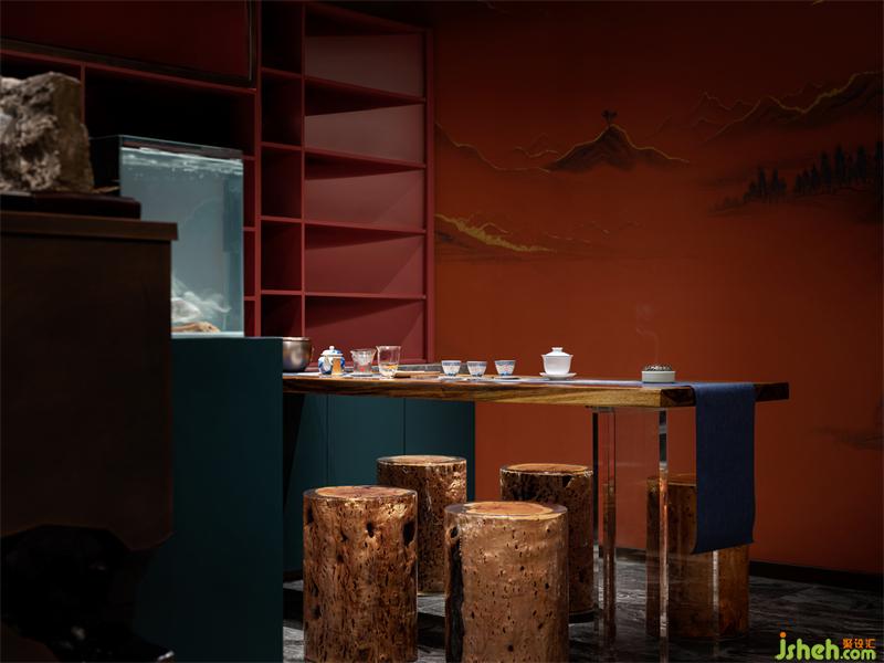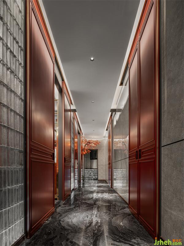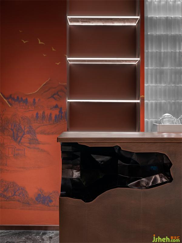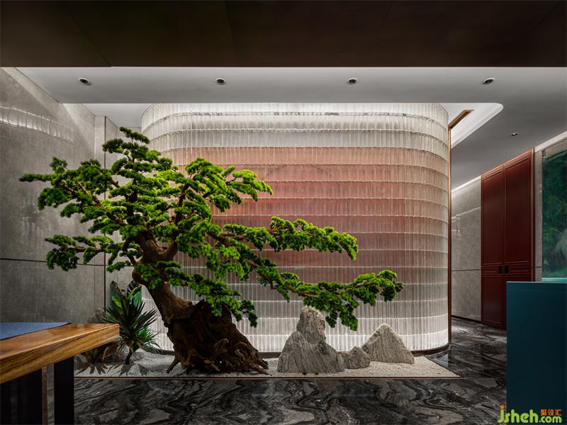 假山和沙石配制出枯山水意蘊,朦朧的玻璃磚墻為背景映襯綠植之靈,山與水,紅與綠,枯與瘦,明與暗,會所設(shè)計師擷取人們熟稔的青綠山水畫的一角融入會所,賦予空間情與景相融、出入畫中的氣韻。