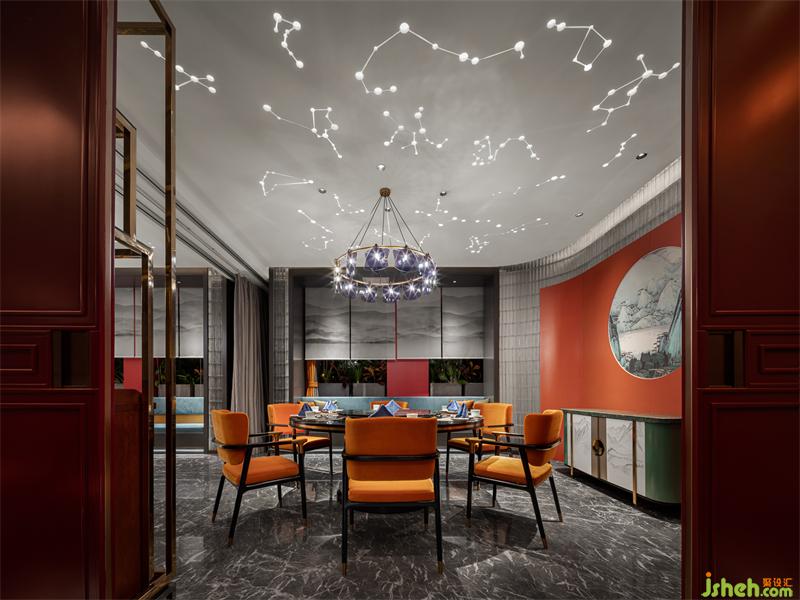 會所設(shè)計沿著契合故宮建筑對稱美的過道,來到大小包房。圓桌居中,桌椅圍擺,山水屏風(fēng)造近景以呼應(yīng)窗簾上層層疊疊的遠山與云霧風(fēng)景。大包間里,大理石的自然紋理以溫潤質(zhì)感,為空間打下沉著內(nèi)斂的基調(diào);大吊燈華光璀璨,是氛圍烘托、營造場景的能手;相連的星宿圖將囊獲寰宇的視角,投射在天花上。