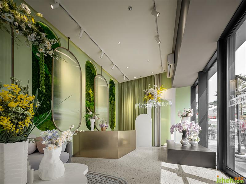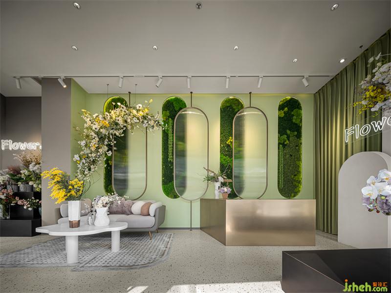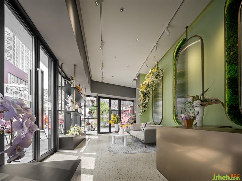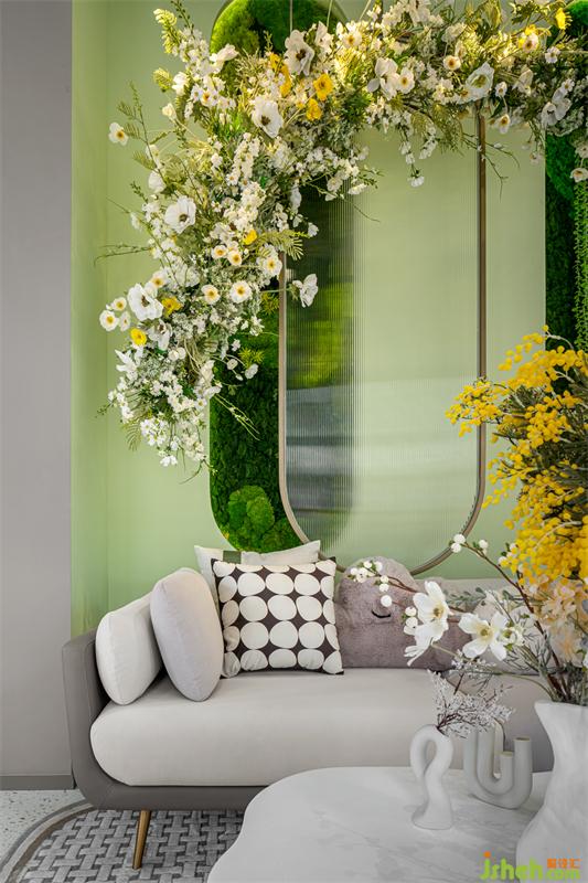 素雅的室內(nèi)佈局為花卉搭建出展示舞臺(tái),壁上框景展示草木之美,鏡面造景反射花容之姿,亞克力借景半遮半掩,洩露花卉若有似無的秘密。