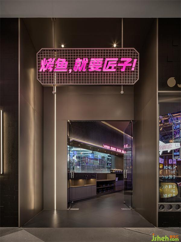 該匠子烤魚升級店兼?zhèn)淇爵~+吐槽功能,空間以酷黑色為主色調(diào),輔以魚市常見的紅磚和金屬色的同時,將匠子烤魚的品牌色融入到視覺導向系統(tǒng)中。