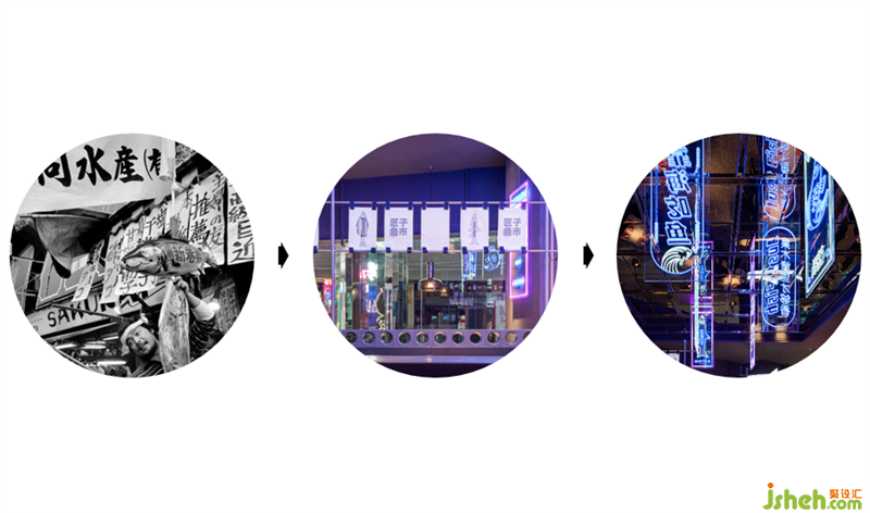 魚市中的吊旗和裝貨箱元素被轉(zhuǎn)嫁到室內(nèi)空間。吊旗以霓虹燈的形式出現(xiàn)在空間的中庭,集裝箱符號陣列出墻體,集市的氛圍瞬間拉滿。