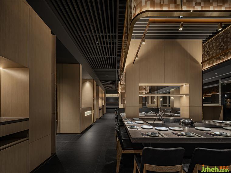 主鐵板操作臺,作為空間視覺核心,由淺木色做底,淺灰、深灰外立面上下聚合,搭配暖調(diào)燈光組成,完成了核心色彩與內(nèi)容填充。古銅金元素的介入將空間的色調(diào)與材質(zhì)稍稍“破局”,也與大漁的風(fēng)格調(diào)性遙相呼應(yīng)。