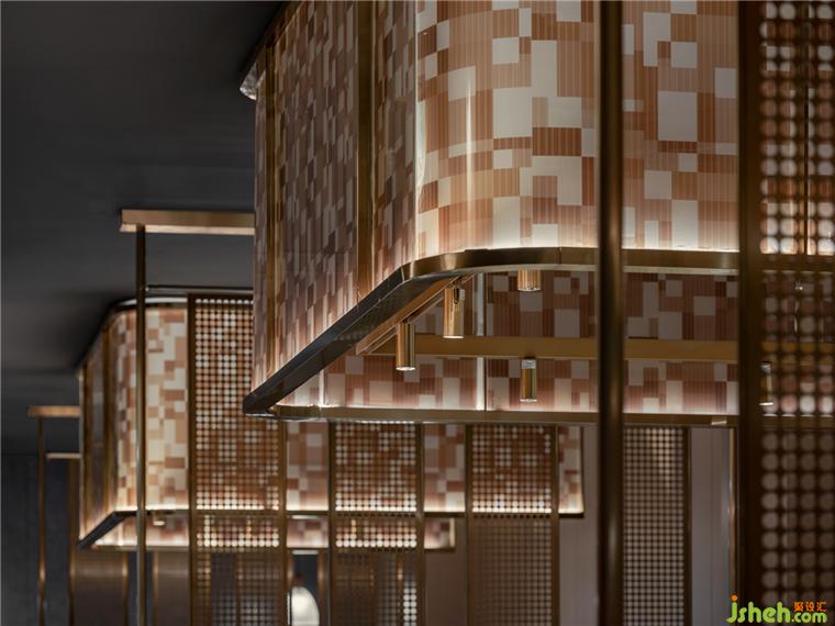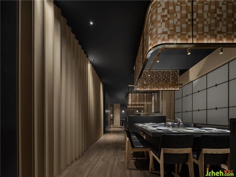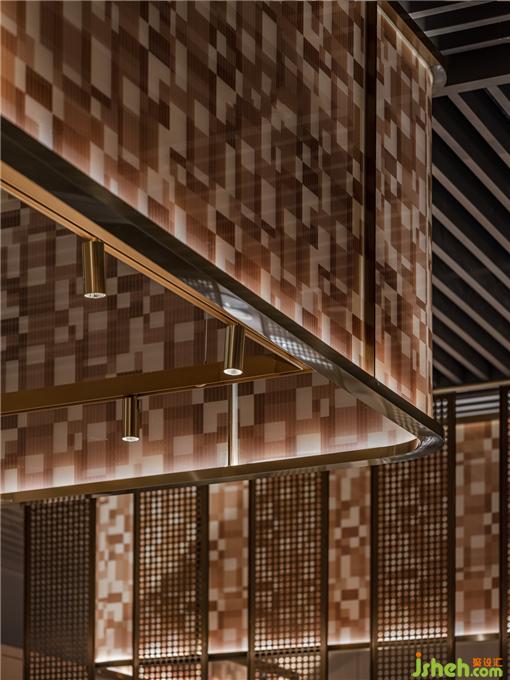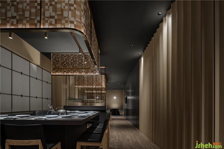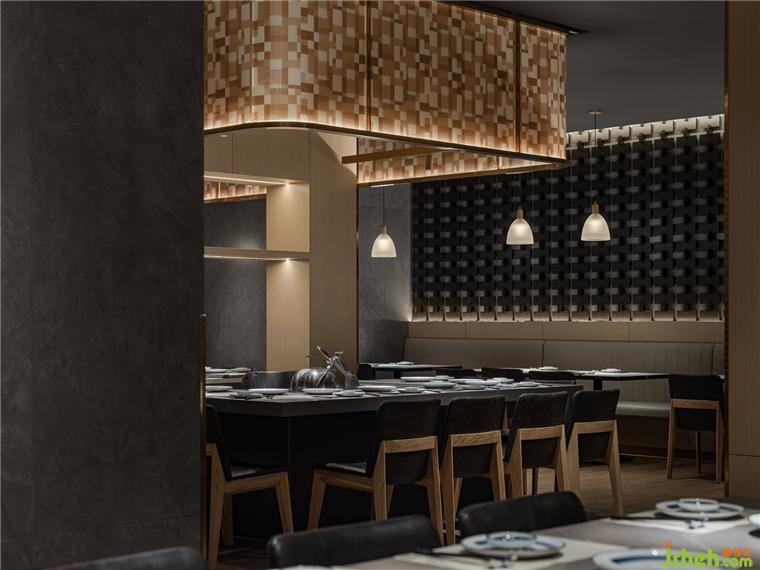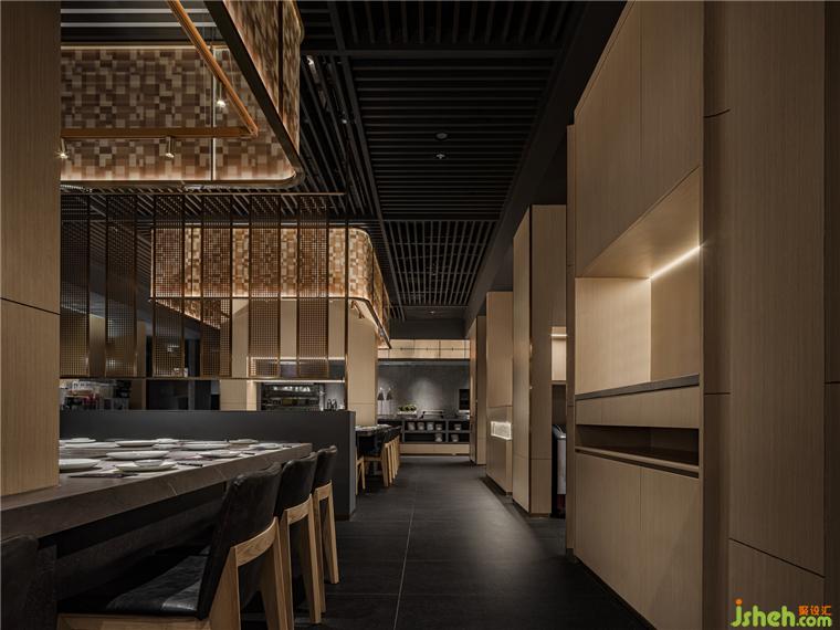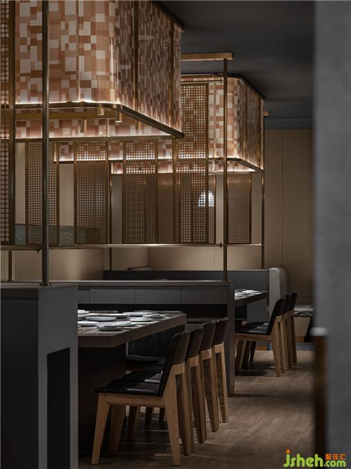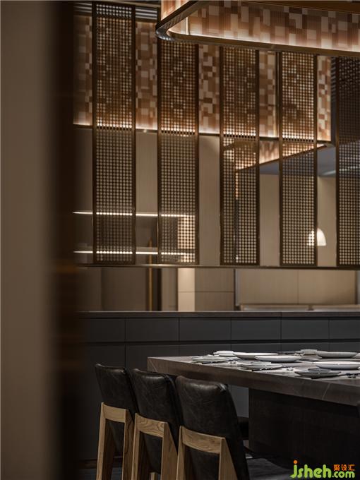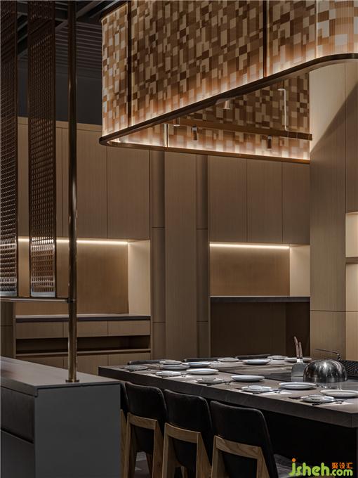 散落于下方的光源亦如暖色線條般,餐廳設(shè)計引領(lǐng)著食客來到可面對廚師、欣賞到鐵板全過程的區(qū)域。在此,三五好友可相鄰而坐,在因炙烤而彌散的煙火氣中,卸下疲憊,感受食物帶來的滿足與愜意。