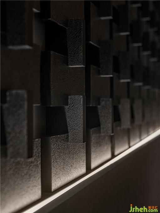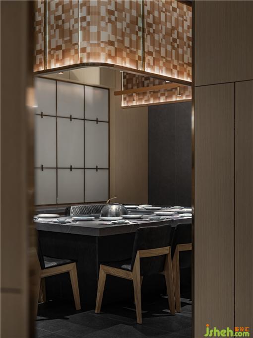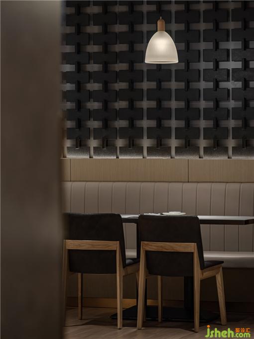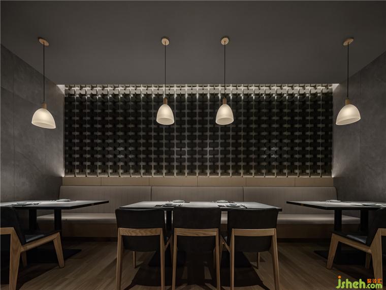 在燈光點(diǎn)綴下,十字金屬結(jié)構(gòu)墻,質(zhì)樸的材料,肌理的紋路,成為了重要的氣氛制造者。餐廳設(shè)計(jì)讓人在進(jìn)入空間的剎那,便能迅速感知到設(shè)計(jì)試圖營(yíng)造的質(zhì)感與溫暖并重的氛圍。