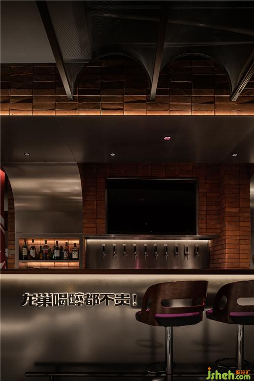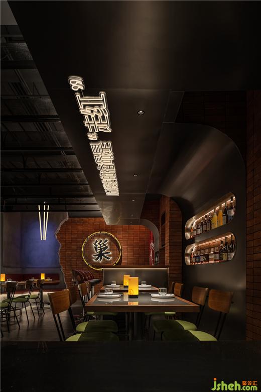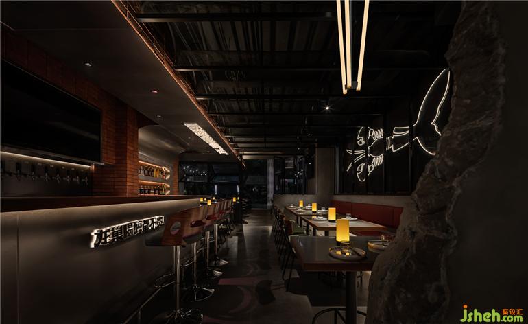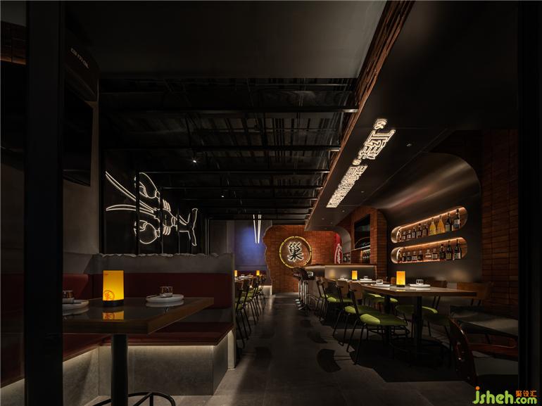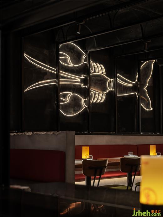 日升明亮,午間柔和,夜晚朦朧。光的介入,讓空間變得流動(dòng)而長(zhǎng)續(xù),作為流動(dòng)的圖象,光在空間里得到了充分的釋放。龍巢餐酒館設(shè)計(jì)通過(guò)置于空間中的大型燈光裝置,映射出龍巢的烤魚龍蝦主題,美食與裝置藝術(shù)相映成趣。各色冷暖光從各處迷幻曖昧的探出頭來(lái),呼應(yīng)營(yíng)造神秘又舒適的飲酒氛圍。