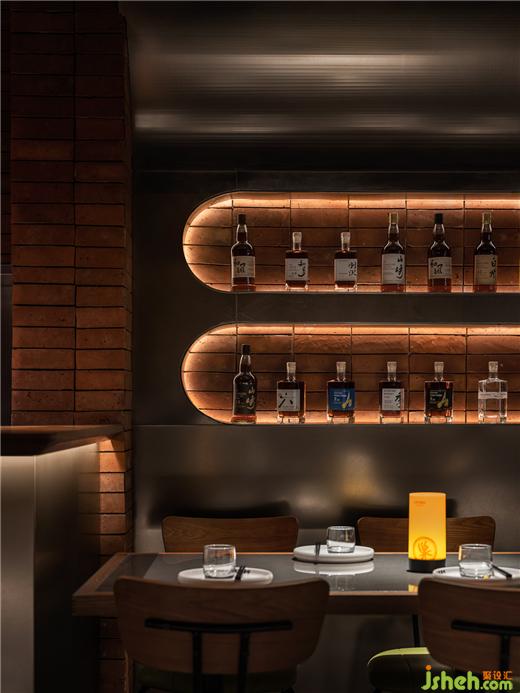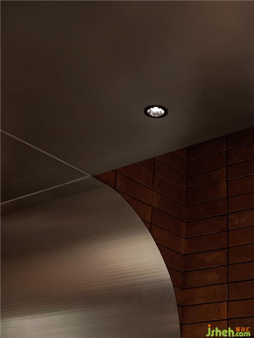 踱入其中,空間意象經(jīng)由材質(zhì)組合實(shí)現(xiàn)解構(gòu)與傳遞,光的金屬面與裸露在外的原始磚砌結(jié)構(gòu)形成了鮮明的對(duì)比,混凝土、不銹鋼、光在此融于一體,龍巢餐酒館設(shè)計(jì)打破空間固有格局,完成空間氛圍營(yíng)造,向食客傳遞舒適而自如的場(chǎng)域信號(hào)。