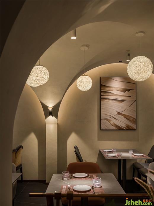 褪去紛繁復(fù)雜,一切回歸簡(jiǎn)單質(zhì)樸,光影在虛實(shí)間交迭相生,發(fā)出輕緩的詠嘆。深圳餐廳設(shè)計(jì)在光線渲染與體塊的創(chuàng)造下,空間追隨時(shí)間變換深淺色彩,流露出靈動(dòng)之美。