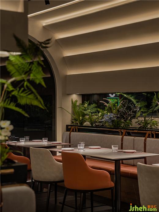清新溫潤(rùn)的綠植詮釋自然美學(xué)主義,蔓延中悄然淡化空間的清冷與疏離感。一花一葉安靜地守候一隅,具有鮮明品牌印記的裝飾燈管淺淺藏匿于草叢,深圳餐廳設(shè)計(jì)將御牛紀(jì)的故事向食客娓娓道來(lái)。