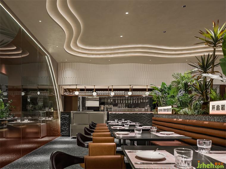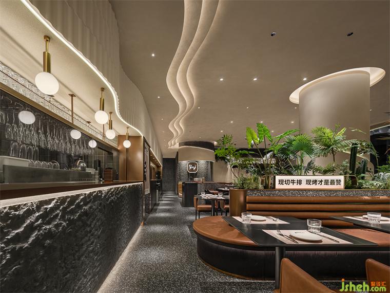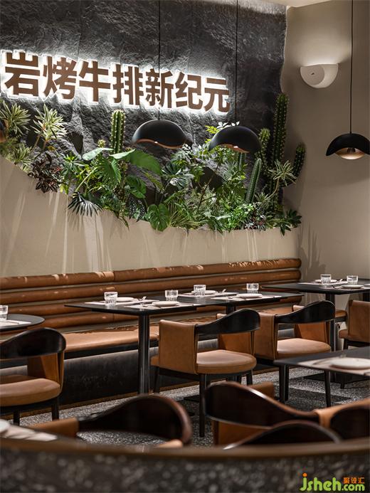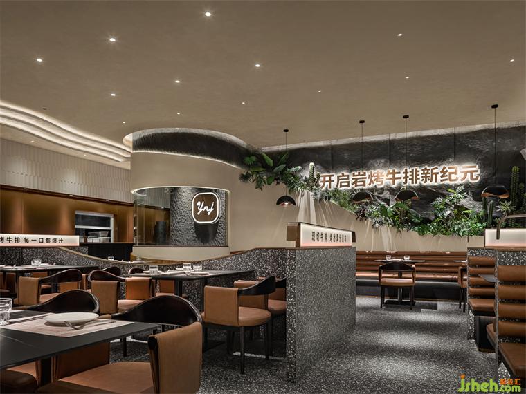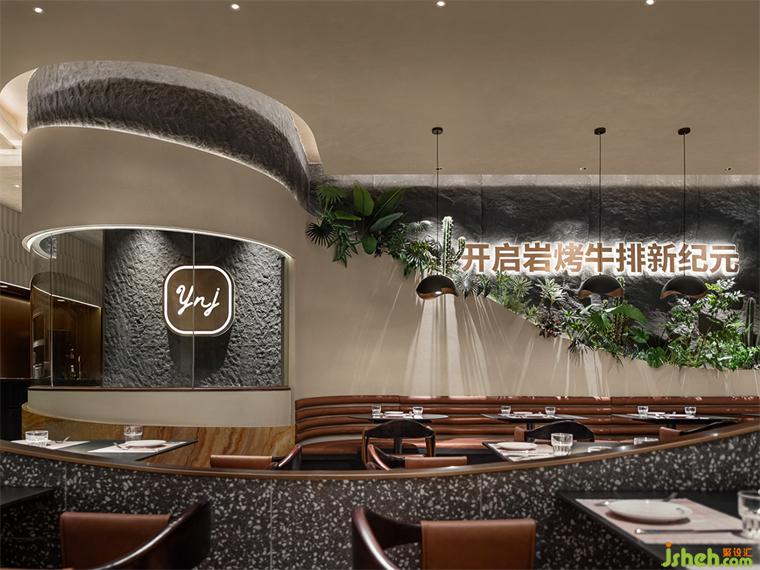 弧形曲面線條圍繞半透明的烤扒房向外劃出新月的邊緣。餐廳設(shè)計輕質(zhì)仿石的運用猶如地表裸露的巖石肌理紋路,直接展現(xiàn)巖質(zhì)地貌的野性與粗獷。黯黑的巖壁之上,“開啟巖烤牛排新紀(jì)元”的關(guān)鍵標(biāo)語和品牌logo在強烈的色調(diào)對比下更顯醒目。