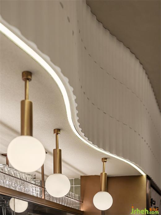 風(fēng)聲蕭蕭,飛沙揚礫。風(fēng)以瀟灑的筆觸造就一幅幅驚艷的沙畫,也成就了空間內(nèi)流暢蜿蜒的絕美曲線。餐廳設(shè)計層疊的沙波、線性延伸的隱性燈光,閃耀成瀲滟的沙丘細浪。