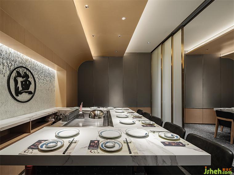 進(jìn)入包間內(nèi),收獲船艙里觀海的獨(dú)特視角。鐵板燒設(shè)計(jì)天花與墻面連接處呈現(xiàn)翻滾的海浪型,契合航行捕魚的主題,使得與海相關(guān)的風(fēng)物變得更可視化。推拉門的設(shè)計(jì)讓2個(gè)空間的分隔與貫通自由靈活。