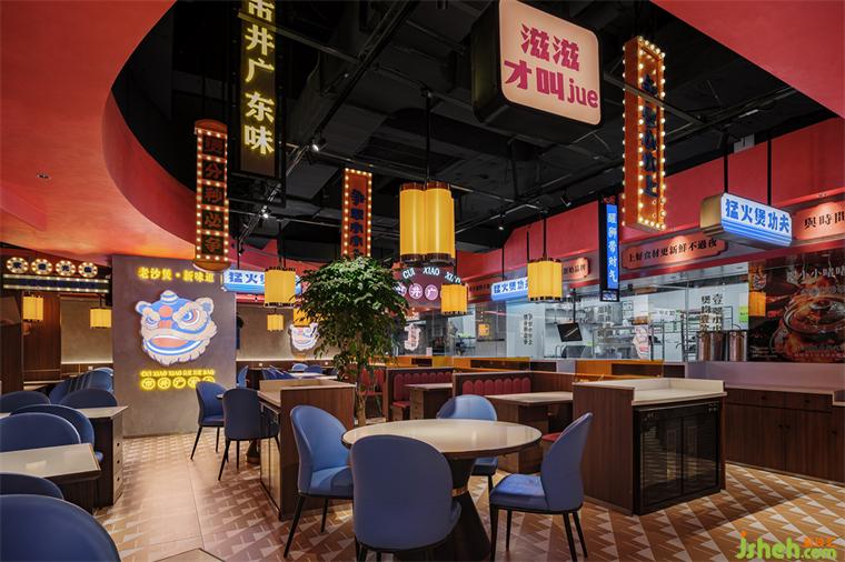 傳統(tǒng)的嶺南建筑輕巧素淡,古韻悠然,一磚一瓦代表的形制與符號是跨越古今的審美藝術(shù)性、文化認(rèn)同感的交匯。設(shè)計(jì)師擷取飛檐翹角、扇形古窗、梅花紋理、仿古窗欞等濃縮嶺南特征的重要元素,通過簡約的現(xiàn)代線條形體衍生為餐區(qū)結(jié)構(gòu)、霓虹燈牌、吊燈,賦予空間具備地域?qū)傩缘奈拿髅艽a。