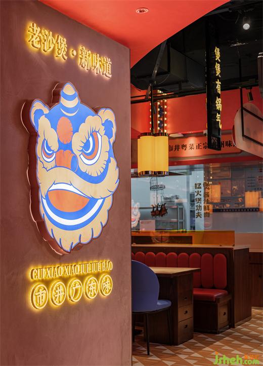 主入口展示板、外墻立體發(fā)光燈箱、店內(nèi)背景墻多處調(diào)用瑞物“醒獅”。鼓聲擂響、威震八方,獅形威武雄壯、俊武矯健,餐廳設(shè)計(jì)貫穿內(nèi)外的意象在起承轉(zhuǎn)合間呼應(yīng)舞獅表演中的“臨門采青”環(huán)節(jié),以設(shè)計(jì)的表達(dá)形式傳遞根植于本土的歷史內(nèi)涵。