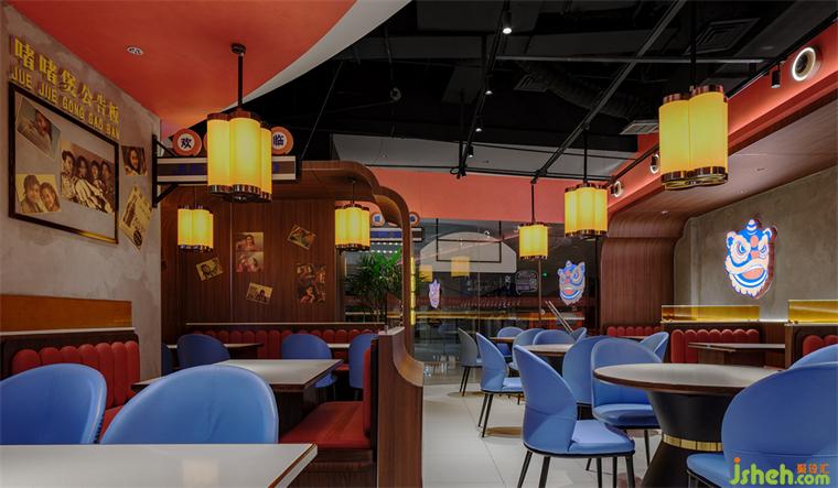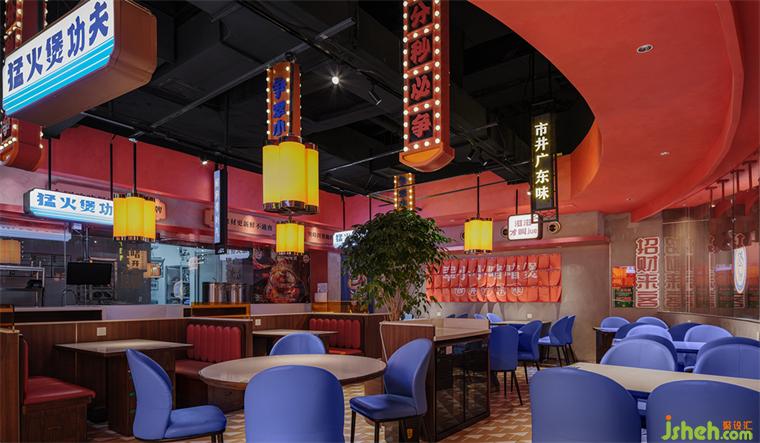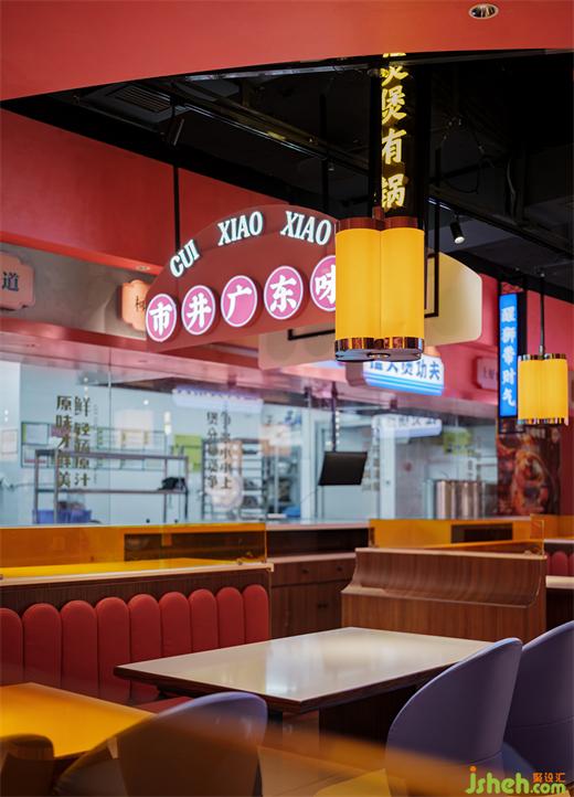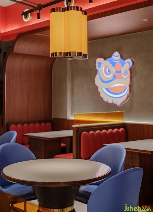 紅色,蘊(yùn)含現(xiàn)代廣東人喜愛的大吉利是、興旺發(fā)財(cái)?shù)暮貌暑^。藍(lán)色,嶺南建筑鐘情的淺淡基調(diào)。二者相互映襯,餐廳設(shè)計(jì)以冷暖對(duì)比強(qiáng)烈卻不違和的茄紅色和翠藍(lán)色成為空間主色調(diào)。