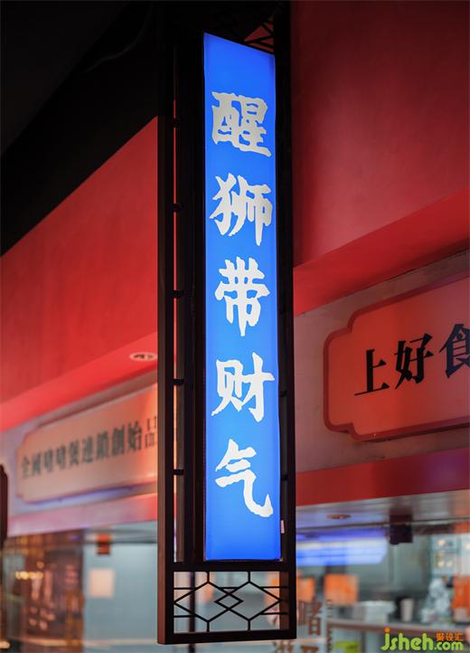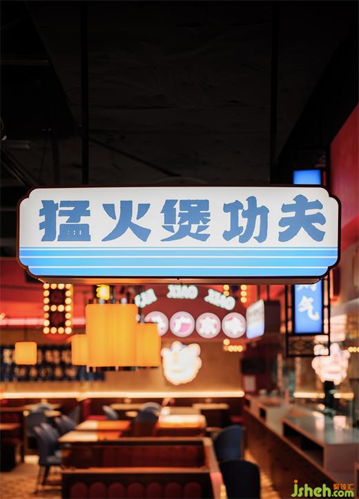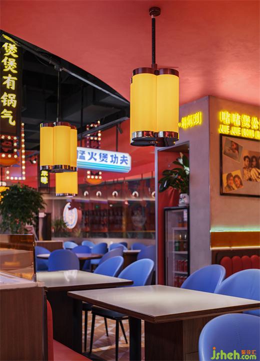 經(jīng)典閃爍的霓虹燈招牌,投射出過去街頭繁華的城市商業(yè)縮影。餐廳設(shè)計(jì)顯眼絢爛的幻彩燈光結(jié)合醒目的特色標(biāo)語(yǔ),舊時(shí)代的產(chǎn)物經(jīng)由我們熟悉的視覺場(chǎng)景語(yǔ)言,烘托沉浸式的市井氛圍。