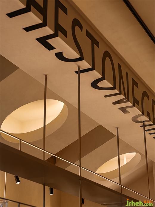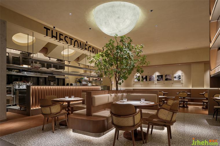 英文品牌名“THE STONEGRILL”跳脫出平面呈現(xiàn)形式,隨橫梁構(gòu)造以特別的文字折疊法居于吧臺頂端,猶如粼粼的水波紋,展現(xiàn)搶眼的立體感。餐廳設(shè)計簡潔的表達(dá)使吧臺更和諧地融入主體空間,洞穴天花、月亮燈、樹木相互掩映,演繹秘境里蓬勃的生命力。