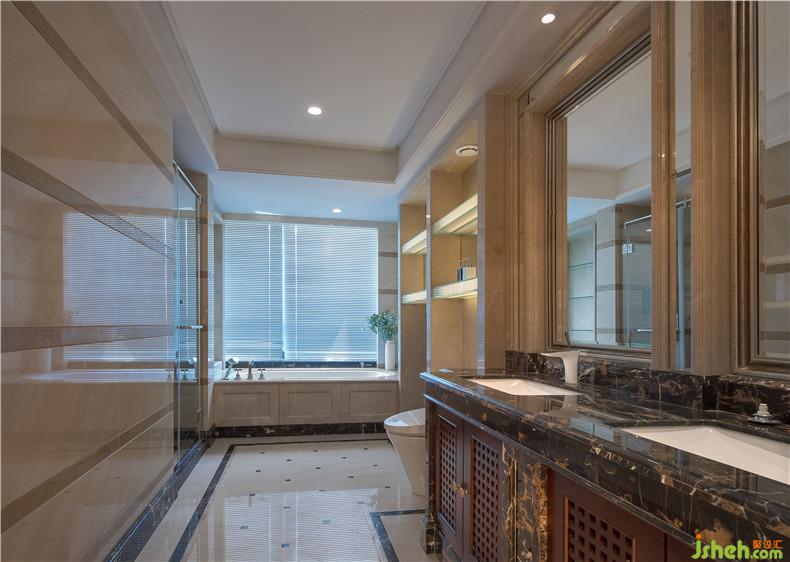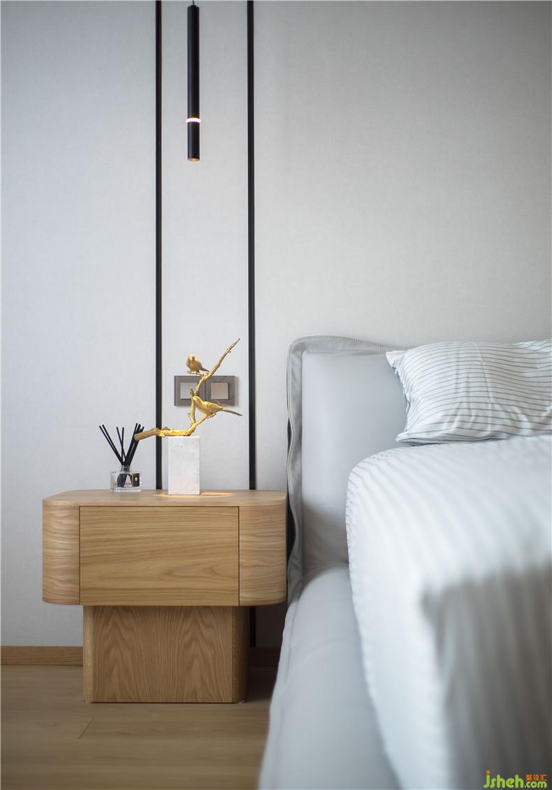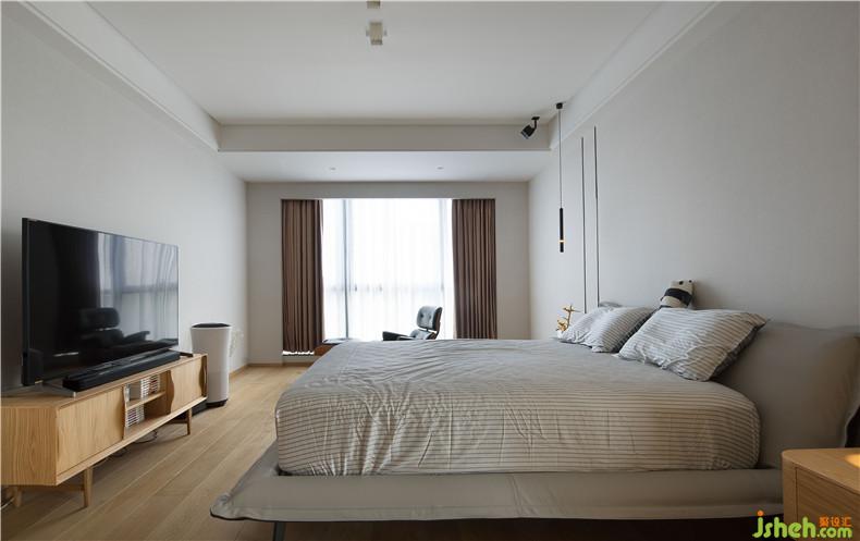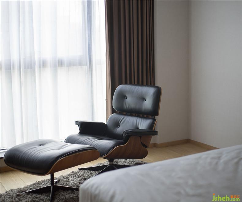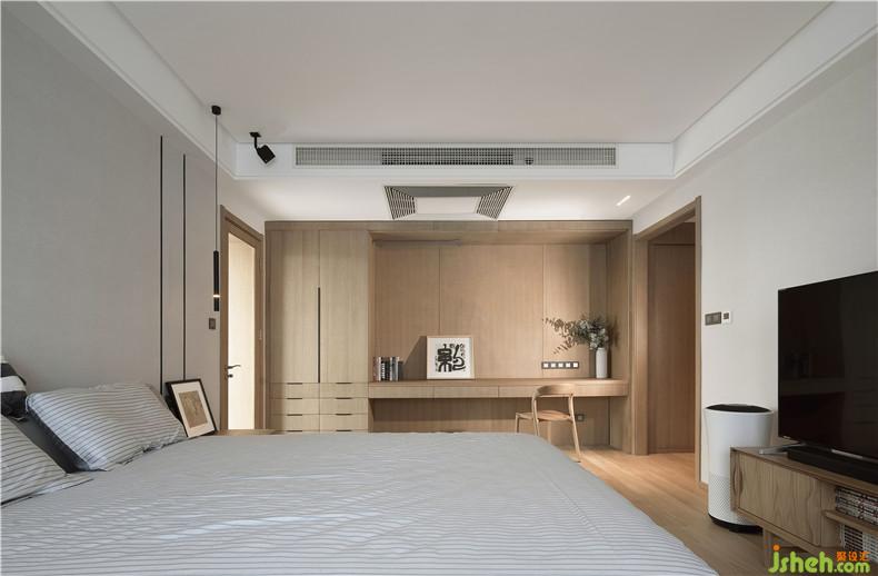 主臥室室內(nèi)設(shè)計師考慮到業(yè)主繁忙的管理工作和個人愛好,做了一個非常開放的大長臺案,既可以作為書桌、也可以堆放、掛放衣物、也可以擺放林總喜歡的動漫玩偶。這是一個比較開放自由的功能。