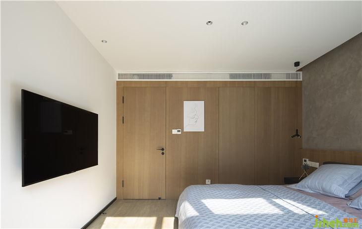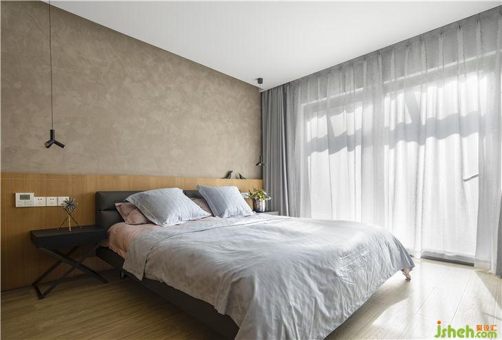 臥室結(jié)構(gòu)盡量簡化,依據(jù)功能設(shè)置進(jìn)行色塊構(gòu)成,水泥漆的加入對比出木作的暖。
