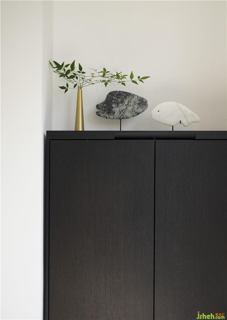 餐廳左側(cè)是從地下車庫進(jìn)來的入戶門,為了維持整個空間的簡潔,入戶門做成了隱形門。餐邊柜上的插花植物就是院子里折來的,經(jīng)濟(jì)、方便四時常有,卻非常的惹人注目,筆者大愛。