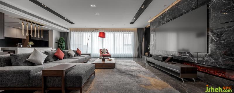 客廳區(qū)正對大海,夏天的海濱清新宜人陽光閃耀。因此室內(nèi)設(shè)計師在客廳選用基調(diào)為高級灰,云朵拉灰石材、意大利灰墻面與棕色影木、灰調(diào)布藝家具組合出涼爽、沉穩(wěn)的氣質(zhì),紅艷艷的壁爐與釣魚燈點綴出夭夭灼灼的華美。