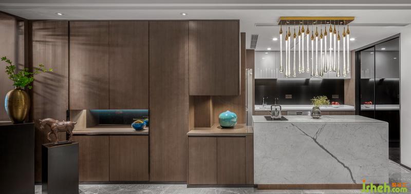 業(yè)主常年海外國內(nèi)交替居住,比較喜歡西餐咖啡、加上度假住宅,平時基本就兩人用餐,所以廚房區(qū)做了開放的西廚和右側(cè)封閉的小中廚(中廚房是原有的設(shè)備陽臺改造而來),業(yè)主非常喜歡在吧臺用餐,所以室內(nèi)設(shè)計師在客廳和西廚之間自然橫置了一個雕刻白石材吧臺,在形態(tài)組織上延伸了儲藏酒柜、空間畫分上界定西廚與客廳區(qū)域分割。