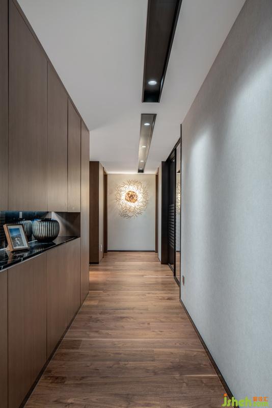 走廊空間室內(nèi)設(shè)計師利用亞麻壁紙與影木一起,形成柔和而雍容的質(zhì)感。