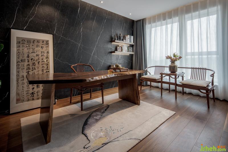 茶室區(qū)凸顯中國人的內(nèi)斂與自然之美,黑白根麻面石材、鄧板橋的書法、一壺琵琶,與窗外的山景勾畫出業(yè)主千帆閱盡后的從容與恬靜。