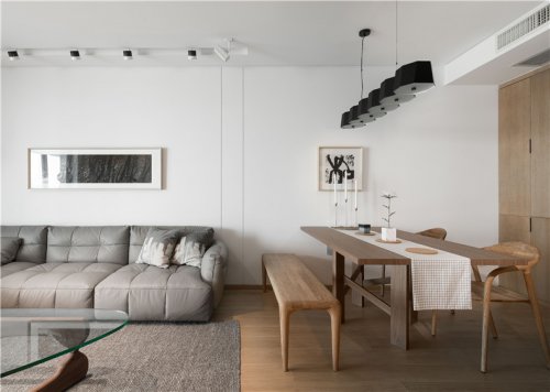 右側(cè)餐廳區(qū)原本是一間客房,因為沒什么用處,將其拆除后改造成現(xiàn)有餐廳,蘑菇面蒙古黑石材墻面將客廳的穩(wěn)定與低調(diào)延伸至餐廳區(qū),影木模糊不定的光影感,為燭光晚餐提供一種灼灼其華的浪漫。