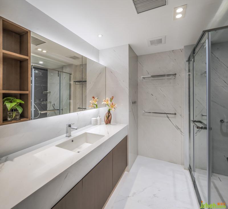 衛(wèi)生間功能性設(shè)置為主,馬桶區(qū)淋浴區(qū)與臺盆區(qū)并列設(shè)置,長長的鏡柜一半封閉一半敞開,兼顧儲物與日常生活。