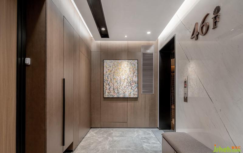 電梯廳原本是公共區(qū)域,業(yè)主劉總由于非常支持我完成作品,出錢對電梯廳拆除改造,因為電梯廳為業(yè)主獨(dú)用,所以也未影響到其他鄰居。室內(nèi)設(shè)計師改造后的電梯廳簡潔、沉穩(wěn),同時增加了鞋柜與換鞋凳功能。