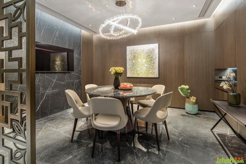 由于是度假住宅,餐廳區(qū)并不大,由于建筑缺乏戶外窗戶,因此四周光帶和頂部冷暖交替的燈光設(shè)計成為空間重點(diǎn),讓就餐空間溫馨中略顯氣質(zhì)。
